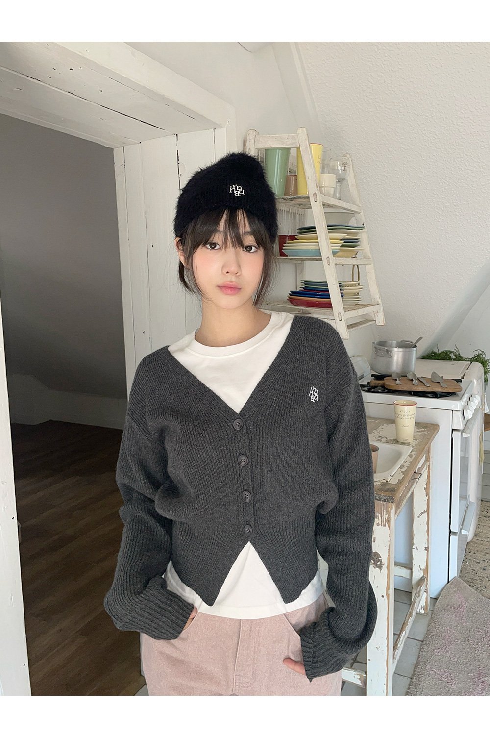 MuahMuah Stitched Wool Knit Cropped Cardigan [Charcoal]